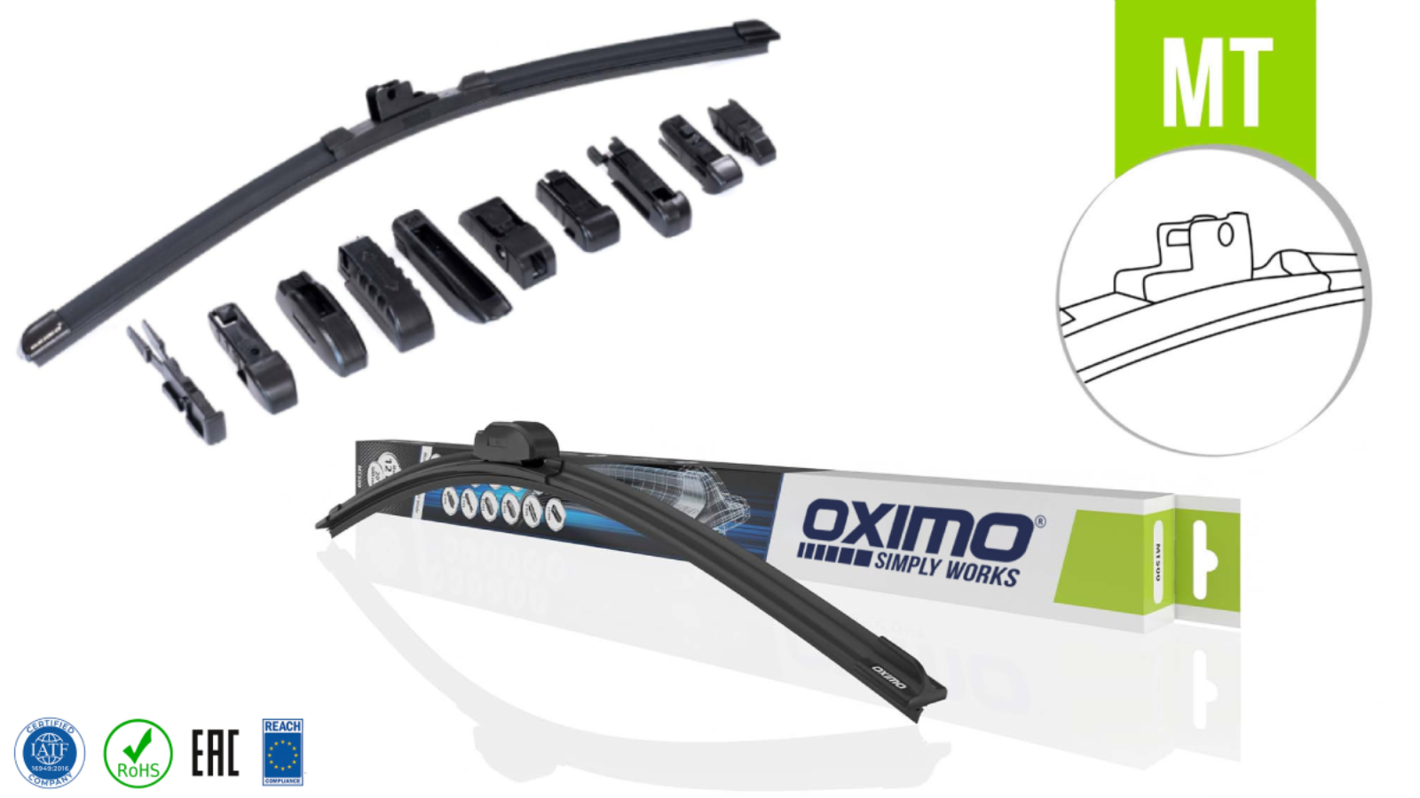 Безкаркасні двірники Oximo Multi-Type (MT) – Універсальність та Надійність Серія Oximo Multi-Type (MT) — це інноваційні безкаркасні склоочисники, розроблені для забезпечення максимальної сумісності. Завдяки унікальній системі змінних адаптерів, ці щітки підходять до 99% автомобілів на дорогах України, вирішуючи проблему підбору специфічних кріплень. Одна щітка — 12 типів кріплень В упаковці кожного двірника Oximo MT знаходиться комплект з 10 змінних адаптерів. Це дозволяє встановити щітку на 12 різних типів важелів (згідно з каталогом): U-Type: стандартне кріплення "Гачок" (U). Спеціальні типи: A, B, B1, C, C1, C3, D, E, E1, F, K. Це охоплює такі популярні системи як Push Button, Side Pin, Pinch Tab, Bayonet та інші. Технології та Матеріали Конструкція двірників Oximo MT поєднує в собі передові матеріали для довговічності та тихої роботи: Гума з покриттям PTFE (Тефлон): Лезо виготовлене з високоякісної синтетичної гуми з додаванням полімеру PTFE. Це знижує тертя, забезпечує безшумне ковзання та ідеальне очищення скла без смуг. Сталь High-Carbon: Внутрішній елемент жорсткості зроблений з високовуглецевої сталі. Вона має "пам'ять форми", що дозволяє щітці ідеально прилягати до скла будь-якої кривизни. Захист від корозії: Всі металеві елементи вкриті електрофоретичним шаром (повна гальванізація) для захисту від іржі. Пластик POM: Кріплення та елементи корпусу виготовлені з поліоксиметилену — матеріалу, стійкого до механічних пошкоджень та екстремальних температур. Симетричний спойлер Двірники оснащені вбудованим двостороннім симетричним спойлером. Аеродинамічна форма забезпечує рівномірний притиск на високій швидкості. Завдяки симетрії, щітки підходять для: Автомобілів з лівим кермом. Автомобілів з правим кермом (RHD). Авто з розпашною системою склоочисників (протилежний рух). Технічні характеристики Виробник Oximo (Польща) Серія Multi-Type (MT) Конструкція Безкаркасна (Flat / Frameless) Доступні довжини 350 мм - 800 мм Кількість в упаковці 1 шт. Адаптери в комплекті 10 шт. (для 12 типів кріплень) Матеріал гумки Синтетичний каучук + PTFE (Тефлон) Спойлер Симетричний (двосторонній) Сезонність Всесезонні Всі двірники Oximo проходять суворий контроль якості. Обираючи серію MT, ви отримуєте універсальність, тишу в салоні та безпеку на дорозі.